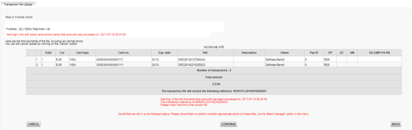 - You can click the “Cancel” button to cancel the file. You are then able to resolve the errors in the transactions and resubmit the file. If you resolve all the issues, the format check will then be successful and you can continue the processing.