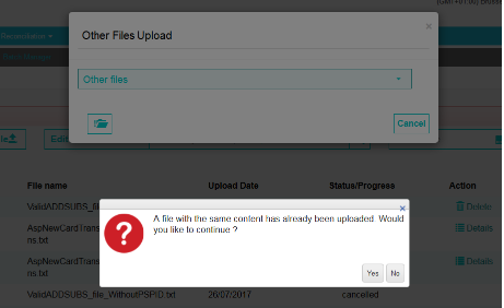 - A list of files uploaded during the last month, containing the same total amounts and/or same sum/addition of card numbers, to prevent you from sending the same file twice